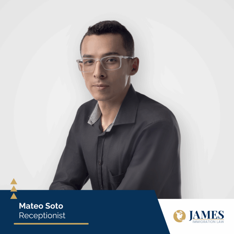 Mateo Soto, recepcionista en James Immigration Law, tiene 31 años y una profunda pasión por las culturas, la música y las artes. Con formación profesional como mecánico de aeronaves, también aporta una amplia experiencia en atención al cliente, habiendo trabajado en diversos países de América Latina y Estados Unidos.