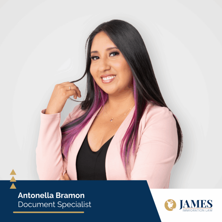 Antonella Bramón, originaria de Perú, posee una Licenciatura en Traducción e Interpretación por la Universidad Ricardo Palma en Lima, Perú. Comenzó su trayectoria en James Immigration Law como asistente administrativa, donde apoyaba diversas funciones de oficina. Con el tiempo y la dedicación, pasó al cargo de Especialista en Registros y actualmente se desempeña como Especialista en Documentos en el equipo de Visas T.