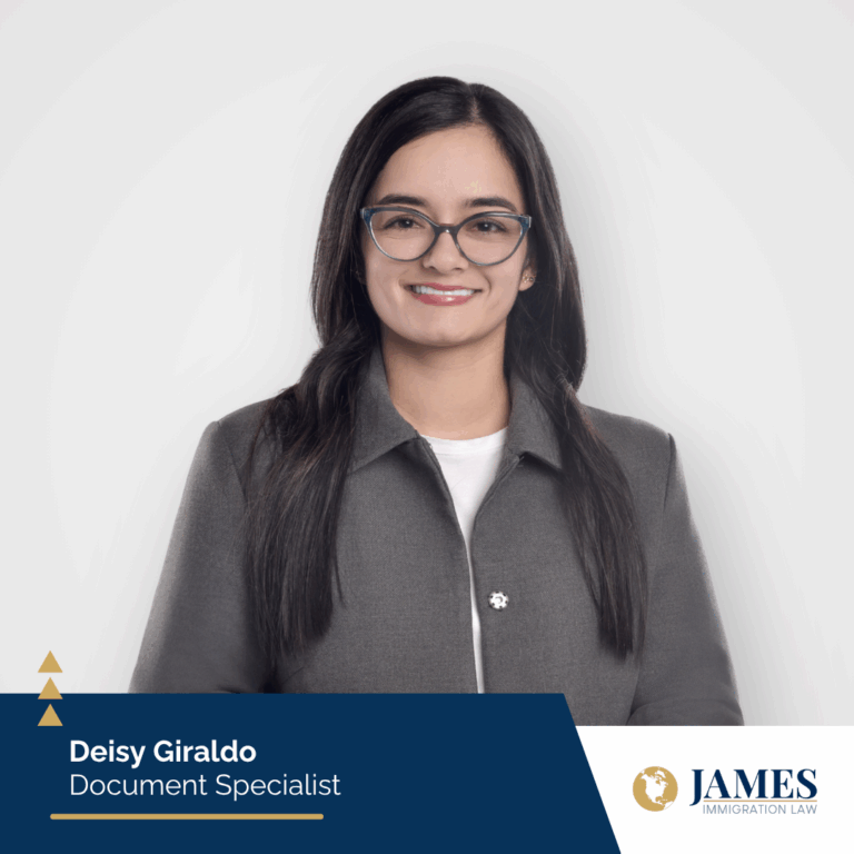 Deisy Giraldo es Especialista en Documentos en James Immigration Law. Se encarga de recopilar y organizar documentos de respaldo, realizar traducciones y mantener una comunicación clara con los clientes a lo largo de sus procesos migratorios.