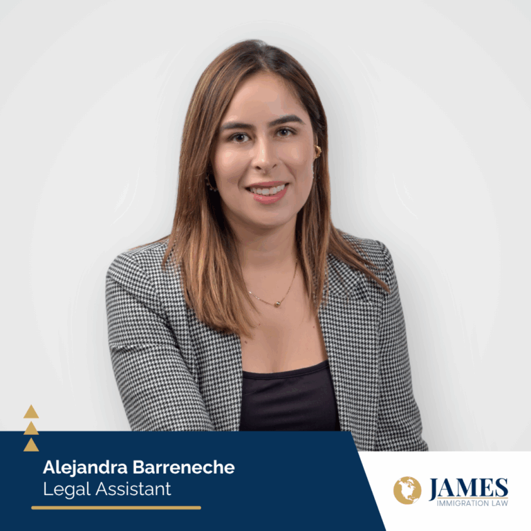 Alejandra Barreneche es Asistente Legal en James Immigration Law, donde prepara formularios de inmigración, redacta cartas de presentación y arma los portafolios de los clientes con precisión y cuidado. Aporta experiencia en la recolección de documentos y el seguimiento de casos, así como una trayectoria previa como Asistente de Inmigración en Nueva Zelanda, apoyando solicitudes de visas en un entorno multicultural.