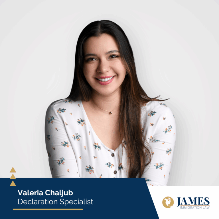 Valeria Chaljub es Especialista en Declaraciones en James Immigration Law, donde se comunica con los clientes y redacta sus declaraciones juradas y otros documentos clave para preparar solicitudes de Visa T.